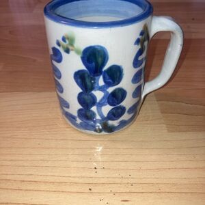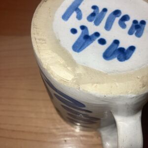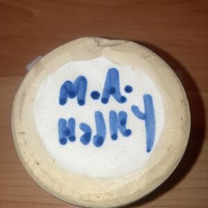 The M A Hadley Signed Hand Painted Pear And Grapes Mug is a vintage ceramic mug handcrafted in the United States. This 10oz mug features a beautiful blue color with a painted backstamp and a hand-painted design of pears and grapes. The brand, M A Hadley, adds a unique touch to this original piece of decorative cookware. This mug is perfect for all occasions and would make a charming addition to any collection of pottery and glass.