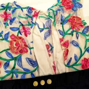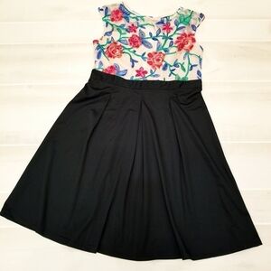 Be the talk of the party with this stand out embroidered mesh floral top with black bottom pleated fit and flare casual party dress. Front of top mesh has a deep v neck where it is just mesh with no lining. There is lining covering the important areas 😁
