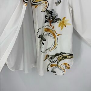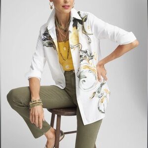 Size 2/12 Stylish Chico's shirt with bold floral patterns. White base with black and gold accents. Perfect for casual wear.
