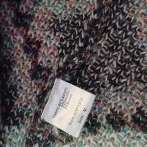 Elan M long sweater. pockets and a covered safety pin to close. 60% acrylic, 20% nylon, 20% wool. excellent pre-owned condition.