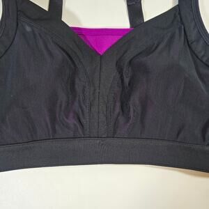 Experience comfort and support with this stylish black and purple sports bra. Perfect for workouts or everyday wear.