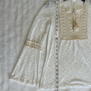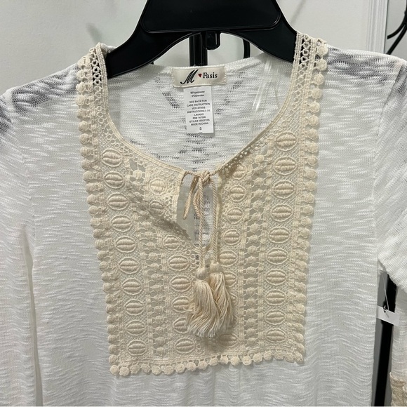 Discover the elegance of the M. Rena blouse, featuring a stylish tie front and intricate embellishments. This white short sleeve top offers a sophisticated touch to any outfit with its delicate design and refined details. In good condition,