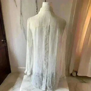 Upgrade your wardrobe with our White Button-Down Blouse in Size M. Made from 100% polyester, its sheer fabric exudes a sophisticated elegance. The versatile design features buttons on both the front and back, with a longer back hem for a touch of modern style. Two front pockets add functionality. Dress up or down for any occasion.