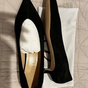 The Marzia kitten heel in black suede, dust bag is included . Beautiful Italian craftsmanship, genuine leather upper and sole, European size 40.5, equivalent to 9.5 US. As comfortable as a flat, but with just the right amount of height, The Marzia is designed for everyday wear. The sculpted kitten heel, the flattering V-cut topline, the distinctive zigzag stitching—every detail was thoughtfully considered to make a timeless pump that you could wear with anything from cropped jeans to flowy dresses. 35mm (approximately 1.4”) suede-wrapped heel.