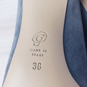 Beautiful and versatile these are a beautiful grey color with a great heel height (about 3"). Size 38 (7.5). I purchased them on Postmark (they were gently used when I purchased them) to wear to an event and have kept them stored since then. No obvious signs of wear on the exterior of the pump although soles show a little wear. They are kid suede upper, almond-shaped toe, buffed nubuck sole with handpainted edges, soft leather lining, lightly padded insole, 70mm block heel, and handmade in Campania, Italy.