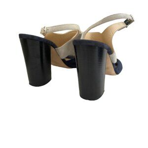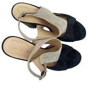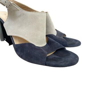 Features include two toned colorblock design with gray and navy blue suede, buckle fastening, and a block heel
