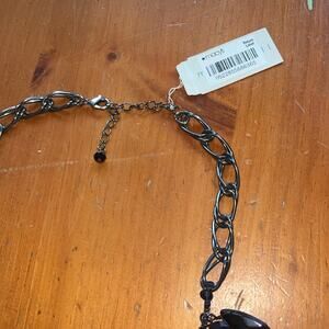 This exquisite necklace by Miriam Haskell showcases a bold black chain adorned with irregular black stones, creating a dramatic cluster effect. The stones are designed to catch and reflect light, making it a captivating statement piece. Perfect for adding a touch of elegance to any ensemble. NWT