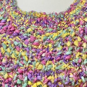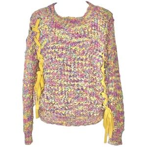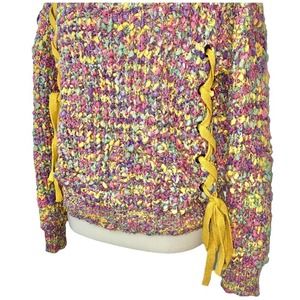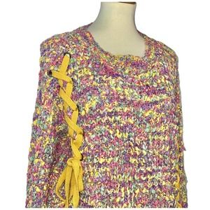 Hersperus Long Sleeve Rainbow Confetti, Slightly Cropped, Chunky Knit Sweater with Metallic Fibers Throughout. Has Mustard Yellow Lace Up Tie Detailing.