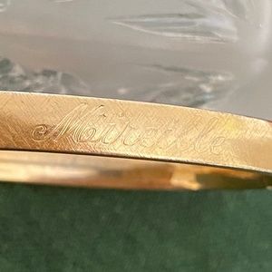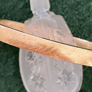 A satin-finish 12K GF bangle bracelet by B.A. Ballou & Co., Inc., given to me in 1975, when I was 5. Engraved lightly "Mireille" in double-line cursive/script on front & back has 3 flowers/roses. In used/vintage condition. Ballou's hallmark, "B" inside 5-pointed star, photo 2, beside 1/20 12K GF stamp. Photos show dent in 1 flower. Approx. measurements, photos 5-6. Closure, photos 7-8, loose but stays closed. Photo 16, "6-19-75" date on interior, Kindergarten graduation! *Price firm/sentimental*
