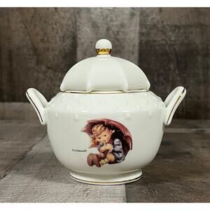 This delightful M. J. Hummel porcelain tea set, titled "Stormy Weather," was produced by The Danbury Mint. It's a charming collectible that brings the beloved Hummel characters to life in a functional and decorative set.