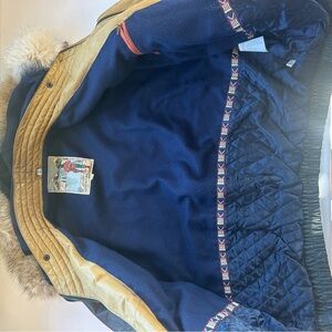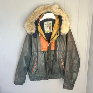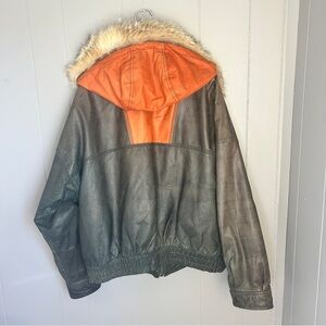 This unique leather jacket has a rugged look and high-quality craftsmanship. It includes a removable faux-fur hood for versatile wear in any season. With a blend of earthy tones, orange accents, and quilted lining, it’s designed for both function and fashion. Multiple pockets provide ample storage, while the snap-button and zipper front closure ensure secure comfort. Perfect for outdoor adventures or city wear, this jacket in size large is a timeless addition to any wardrobe, offering both warmth and an effortlessly cool aesthetic.