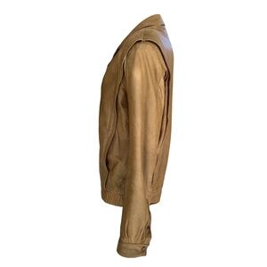Rare, bomber jacket with overlapping off-center aviator moto jacket zipper closing. The superior quality you expect from designer M.Julian, famous for his leather jackets for Wilson's Leather. This classic is buttery soft and feels like it’s lambskin. The leather has a rich patina of age with some of the signs of age you’d expect but it’s in great shape from a jacket from the 80s. Some discoloration and a few small spots and tiny nicks shown in the photos. The lining is in excellent condition with no pulls, holes or tears. Only one actual flaw: The sleeves close with two heavy-duty snaps. When I unsnapped the upper snap on the right sleeve the leather split and partially pulled away from the snap so that snap is not usable. It's a flaw but if you have the other snap snapped it isn't noticeable.