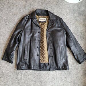 This M. Julian leather jacket, made for Wilsons The Leather Experts, is a classic example of durable and stylish outerwear from the late 1990s to early 2000s. Crafted from genuine leather with a quilted brown lining, it combines both comfort and warmth, thanks to its Thinsulate Ultra insulation. The jacket features a button-up front, two side pockets, and a roomy fit in size large, making it both practical and fashionable. Manufactured in Korea, it reflects the quality and attention to detail that Wilsons Leather is known for. Whether worn casually or dressed up, this jacket offers timeless appeal and is built to withstand years of wear.