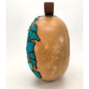 This elegant signed handcrafted gourd art piece by M & K Doolittle features a beautiful turquoise mosaic design and a wooden top. Its intricate craftsmanship makes it an artistic addition to any space. The delicate fern motif and the serene symbol further enhance its unique appeal. Ideal for art lovers and collectors of unique home decor. Three dimensional in texture and appears is just stunning. Collectible art and hard to find, each piece is very unique.