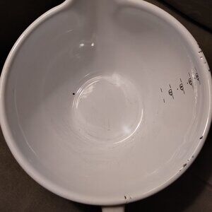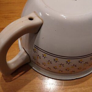 8 cup metal mixing bowl with hard plastic handle. M. Kamenstein 1983. Brown stripes with yellow & brown flower design. Used - some chipping on spout and edges. Dog friendly/non-smoking home.
