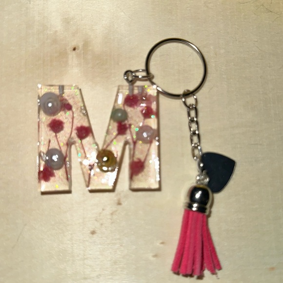 Made by Patty CaSandra. Resin made Keychain with pink flowers and pink and white pearls. The keychain is see thru with a shimmer of iridescent glitter.