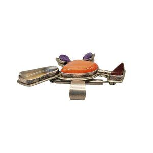 Stunning roadrunner pendant made by Navajo jewelry artist Milton Lee. Sterling silver setting in the shape of a roadrunner with the following stones - charoite, spiny oyster, carnelian and agate. Large bail could accommodate a chunky chain. The pinback has a safety clasp. The back of the pendant is stamped M Lee Sterling.