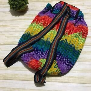This bag is in excellent condition! Rainbow colorful multi color woven fabric. Drawstring knapsack backpack bag style with flor over flap top. 5.3.23 JJ