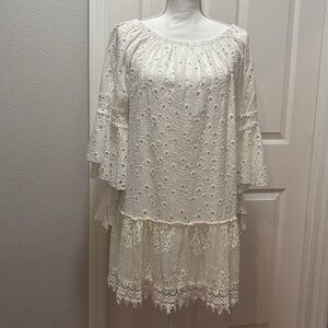 M Made In Italy White Eyelet Crochet Lace Long Bell Sleeve Mini Dress