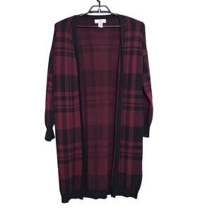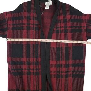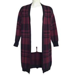M Magaschoni Plaid Cardigan Large Black Burgundy Open Front Duster Thick