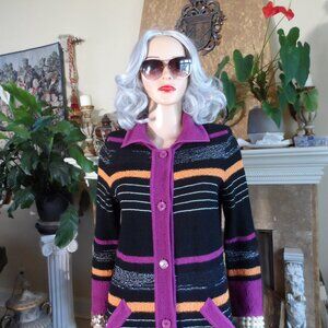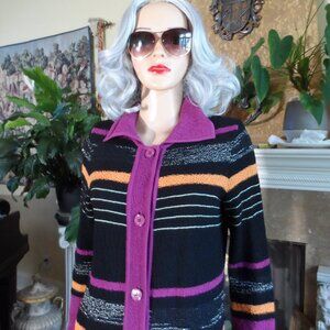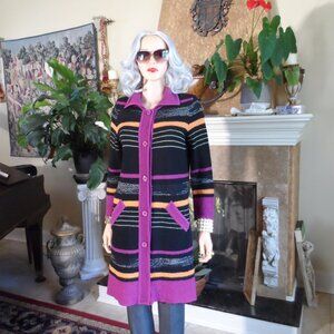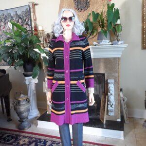 Add a touch of Italian sophistication to your wardrobe with this M Missoni long knit duster coat, crafted in Missoni’s signature textured stripe pattern. Featuring vibrant tones of purple, orange, ivory, and black, this piece perfectly combines comfort with refined style. Details: Designer: M Missoni. Made in Italy. Size: IT 42 / US 6. Fabric Composition: 65% Cotton, 20% Wool, 15% Viscose. Color: Black with multi-color stripes in purple, orange, ivory, and metallic accents. Unlined. Design Features: Button-front closure with tonal purple LOGO buttons. Pointed knit collar. Two front pockets with contrasting purple trim. Long sleeves with ribbed edges. Textured tweed-like knit pattern with Missoni’s signature craftsmanship. Below-knee length. Measurements (approximate): Bust: 36".Waist: 34". Hips: 38". Length: 37". Sleeve: 22". Condition: Excellent condition — fabric is vibrant with no snags, pulls, or discoloration noted. Buttons are intact and secure. Retail for $1250. Comes from a smoke free home.