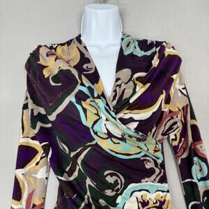 M Missoni Dress Womens Medium Purple Floral Abstract Ruched Faux Wrap Cocktail