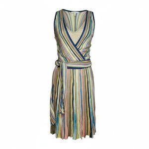 Stunning M Missoni sleeveless wrap dress in signature multicolor striped knit. Features a self-tie waist belt and a soft viscose blend with fluid drape. Made in Italy, this piece embodies the brand’s classic craftsmanship and colorful aesthetic.