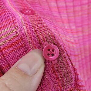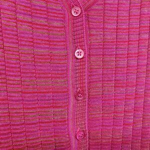 This knit is so gorgeous and has hints of orange and yellow mixed in with the pink. The buttons have a tiny M stamped on each one. Excellent condition!