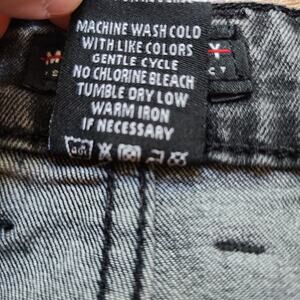 M Society Politically Incorrect Jeans Mens Size 34x32 Black Distressed Patched. Pre-owned, good distressed condition. Measurements are approximately: