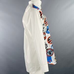 COMME des GARCONS SHIRT long sleeve shirt in a white cotton woven fabric featuring a multi-color Star Wars print, one pocket, and button closure. Made in France.