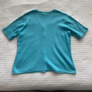 Medium Talbots blue short-sleeve v-neck cardigan. Sleeves are cuffed. 100% cotton. This is in excellent used condition with no stains, rips, tears, or pilling. Measurements in photos.