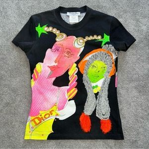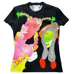 Vintage Fall 2003 RTW Christian Dior By John Galliano Short Sleeve Black Tee with Neon Print Dior Runway Dolls with Various 3D Embellishments. Brand: Christian Dior Size: Medium - 8 Material: 100% Cotton *Measurements* Bust: 17” Waist: 14.5” Length: 21.5”