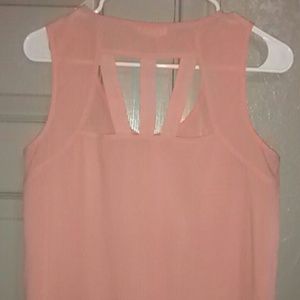 Peach. Sleeveless. Button up. Hugs waist and floaters out on hips. Very cute for casual wear