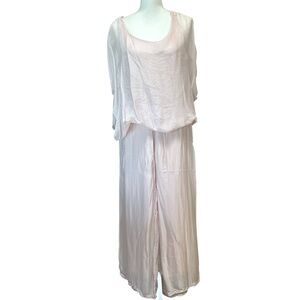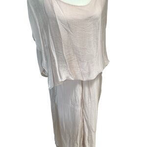 Silky crewneck, short sleeve banded hem poncho top with the silky wide leg pull on pants. Fully lined and amazingly soft. Beautiful blush pink color. This is brand new without tags. Viscose and silk blend. Size XL.