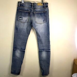 M n m l men's m1 stretch denim jeans have a relaxed fit through the thigh that tapers from the knee to the ankle, with a distress detail at the knee and thigh, finishing off with a 10" concealed zipper on the inseam for a carefully optimized fit.