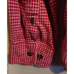 DESCRIPTION: Red plaid button-up shirt with button-down collar and long sleeves