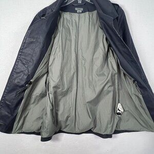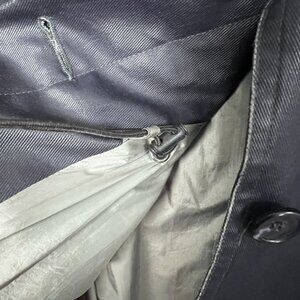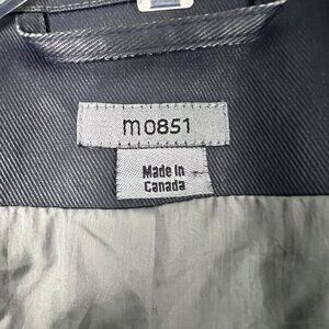 M0851 Waxed Cotton Short Trench Jacket. Black or Charcoal color. Covered button front flap, 4" flip up collar, front flap buttoned pockets. Lined, drawcord inner waist to give a more formed fit.