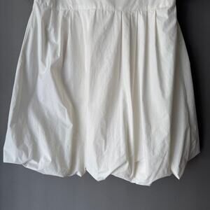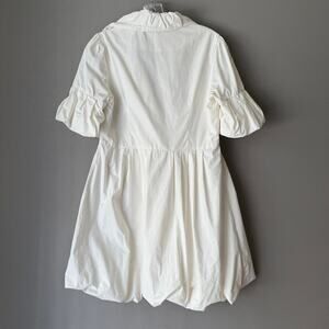 Pre-owned M2m Design by Korea women's white cotton coat, size 77. Features a double-breasted closure with gold buttons, ruffled collar, and short, ruffled sleeves. A-line silhouette with a bubble hem. Made in China. The coat is 100% cotton. The condition is pre-owned, showing no visible imperfections. Care instructions indicate machine wash cold, separately, and tumble dry low. Avoid bleach and ironing.