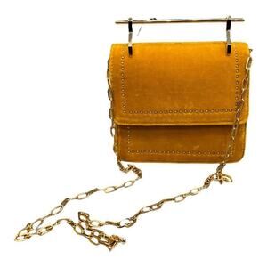 Brand new with tags M2Malletier mini studded top handle bag in a beautiful marigold velvet with gold tone hardware. Crafted of plush velvet and dotted with delicate studding, this structured mini bag has a metal top handle and removable crossbody chain. Very faint discoloration at right side flap as circled in the third from last picture.