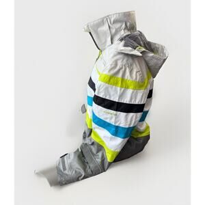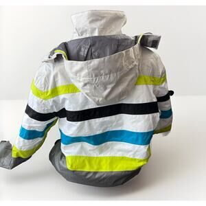 This M3 Millenium Three Men's Snowboard Jacket in size XL features a striped pattern in a multicolor design, suitable for outdoor activities like skiing and snowboarding. Made of softshell polyester material with polyester insulation, it includes a hood, full zip closure, and embroidered logo accents. Ideal for winter and fall seasons, this jacket from China offers both style and functionality for travel and casual wear.