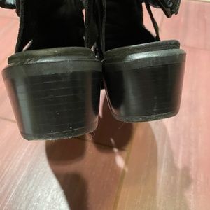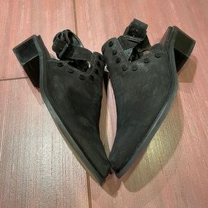 M4D3 Alexa black suede bootie with studs. This edgy and cool boot has trendy studs and western inspired styling. Wrapped straps at cutout heel.