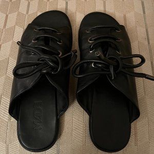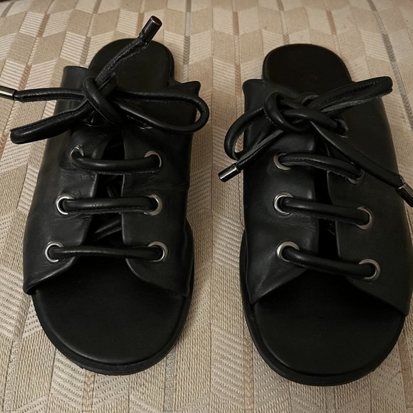 These great black slides are by M4D3. Featuring a soft leather body, these slides have thick laces with metal tips in silver-tone metal. Made in Brazil.