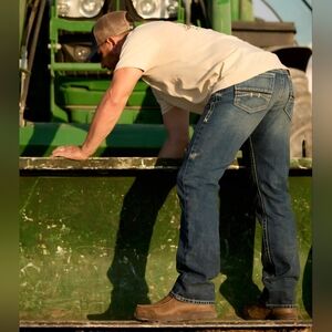These Ariat jeans showcase a timeless straight-leg silhouette in a rich blue hue, highlighted by subtle whiskering and natural fading for a stylish, worn-in appearance. The comfortable fit and ankle-length design make them an ideal choice for versatile, everyday wear.