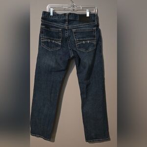 These Ariat jeans showcase a timeless straight-leg silhouette in a rich blue hue, highlighted by subtle whiskering and natural fading for a stylish, worn-in appearance. The comfortable fit and ankle-length design make them an ideal choice for versatile, everyday wear.