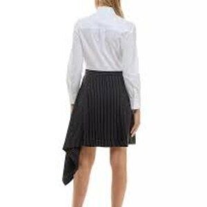 Pinstriped skirt; button at waistband; side overlap with draped detail