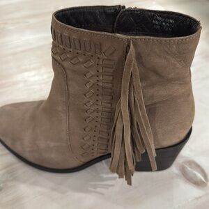 MÍA brown fringe boots with a 2.5” chunk heel. Interior zip closure. Some wear including and slight discoloration reflected in discounted price.