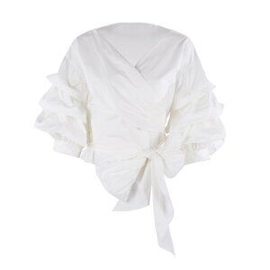 This volume inspired piece has layered frill balloon sleeves an elongated neckline and wrap over front.