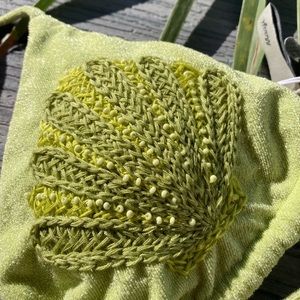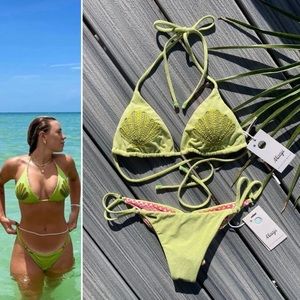 Balmy, where have you been all our lives? This perfect sliding triangle bikini top is ideal for summer vacations. With a terry cloth fabric, reversible 70s style chevron print, and seashell embroidery, the Mellow Green Balmy will set you apart in the cabana or on the beach. ๐