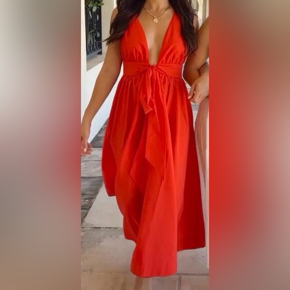 (NWT) Stunning red sleeveless midi dress by MABLE featuring a deep V-neckline and adjustable front tie waist for a flattering fit. Lightweight, flowy fabric with a gathered waist makes this perfect for summer events, vacations, brunch, or date nights. Brand new with original tag attached.