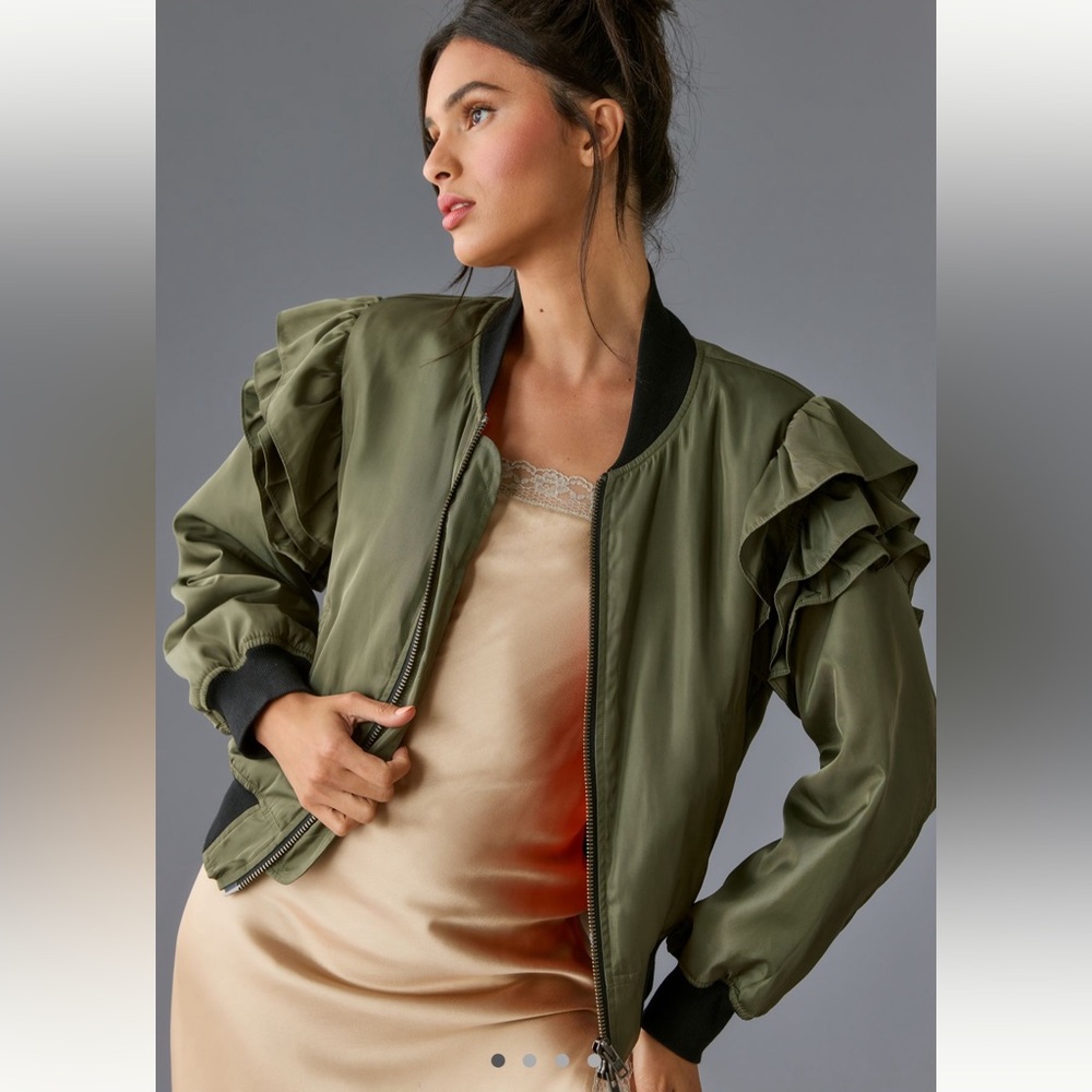 Elevate your style with this olive green bomber jacket featuring chic ruffle sleeves. Perfect for adding a touch of elegance to any outfit.